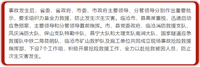 21时20分,总队杨瑞新总工程师带领全勤指挥部3车12人赶赴现场指导救援工作,调派大理支队应急通信保障队1车4人前往增援。21时25分,临沧支队增援力量到达现场。