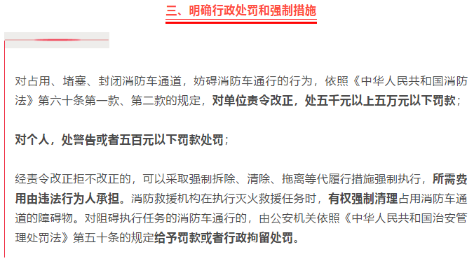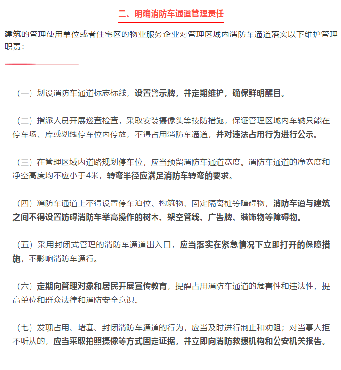 消防车通道是火灾发生时供消防车通行的道路,是实施灭火救援的“生命通道”,国家法律和消防技术标准对消防车通道的设置和管理有明确要求。但是,由于群众法律和安全意识不强、有关单位管理不到位等原因,各地堵塞消防车通道的现象屡禁不止,因此影响火灾救援甚至造成人员伤亡的情况时有发生。加强消防车通道管理,这些措施必须践行落实。