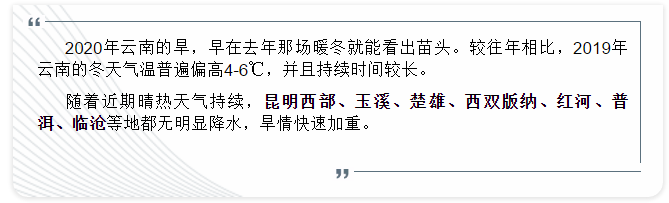 今年2月中旬,云南省气象干旱仅存在于滇中南部和滇西南地区,3月下旬逐步向北发展,目前气象干旱已经覆盖了全省一半的区域,滇中南部和滇西南地区旱情明显偏重,其中滇西南地区存在中度以上气象干旱,部分地区有重、特旱,主要出现在普洱和玉溪。截至目前,全省因旱造成114.09万人、25.84万头大牲畜饮水困难;78条河道断流,115座水库干涸,99眼机电井出水不足,全省农作物干旱受灾35.28万亩,成灾7.62万亩,绝收0.8万亩。