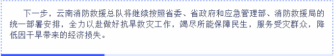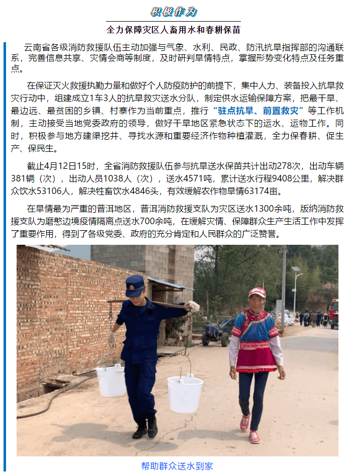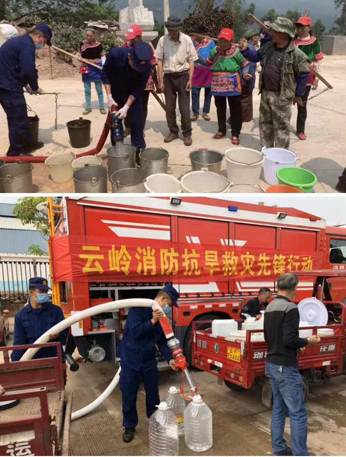 针对严峻的旱灾形势,云南消防救援总队按照省委、省政府和应急管理部、消防救援局的统一部署要求,以习近平总书记“对党忠诚、纪律严明、赴汤蹈火、竭诚为民”四句话总要求为指引,把抗旱救灾工作作为头等政治任务,主动作为、全力以赴投入抗旱救灾保民生工作。