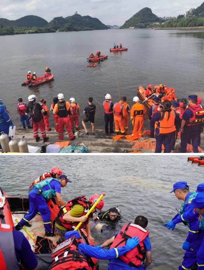 截止于7月7日17时,贵州消防已调集总队机关、安顺支队、贵阳支队共计33辆消防车、21艘救援艇、141名消防救援人员(含19名潜水员)、36套潜水装具、1台水下机器人赶赴现场救援。