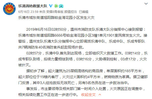 2019年6月16日凌晨2时50分,温州市消防支队乐清大队分指挥中心接到报警:乐清市城东街道旭阳路6666号铂金湾花园小区3幢1单元1901室民房发生火灾。接警后,温州支队乐清大队分指挥中心立即调派乐清中队、乐成中队、乐成专职队共7辆消防车40名消防官兵赶赴现场扑救。